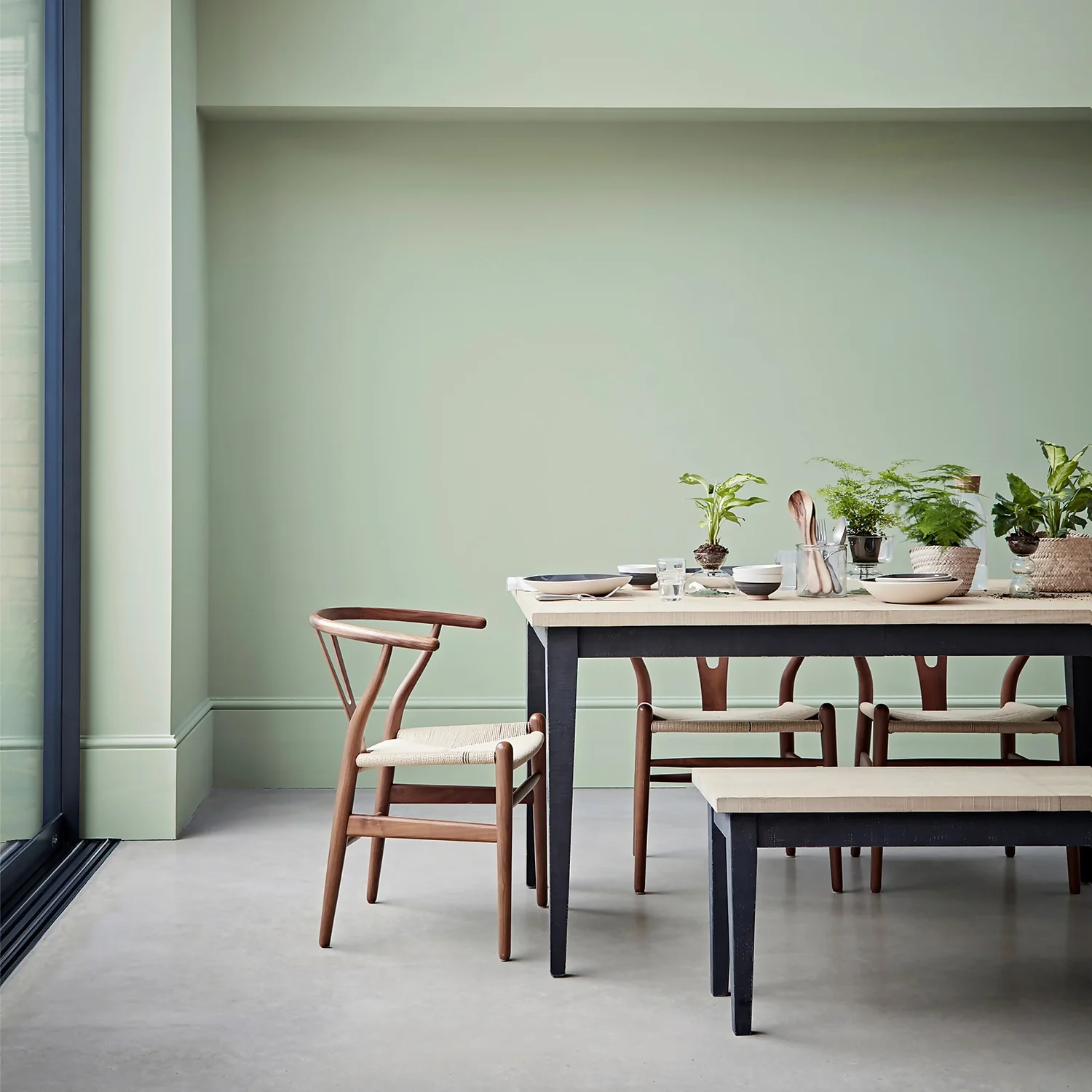 Mellow sage – A Restorative Pale Sage Green Paint . One of 33 colours available in this size, mellow sage is a unique shade of pale sage green paint that provides a calming presence to any room setting. Add character to any space, and to any room, with this beautiful pale green paint. “One of our best sellers. A mid-toned restorative pale green which works well in both modern and traditional properties. Retain a calm scheme with lots of natural materials and furnishings in similar tones, or create interest by adding pops of colour in furnishings and hues, including Crown’s midnight navy®.”