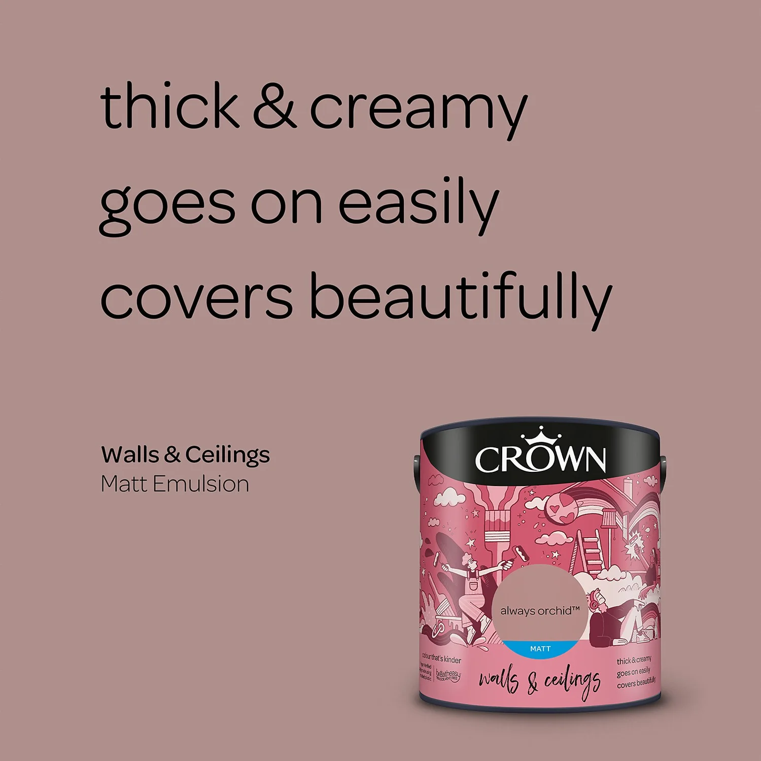 One of 80 colours available in this size, Always Orchid is a unique shade of pink paint that provides a comforting feel to any room setting. Add a touch of warmth to any space, and to any room, with this beautiful pink paint. “Calm and tranquil, Always Orchid offers serenity, a tranquil escape . Mid to deep in lightness, this dusky tone works well in many settings such as a lounge, office, dining room and bathrooms” – Crown Colour Specialist.