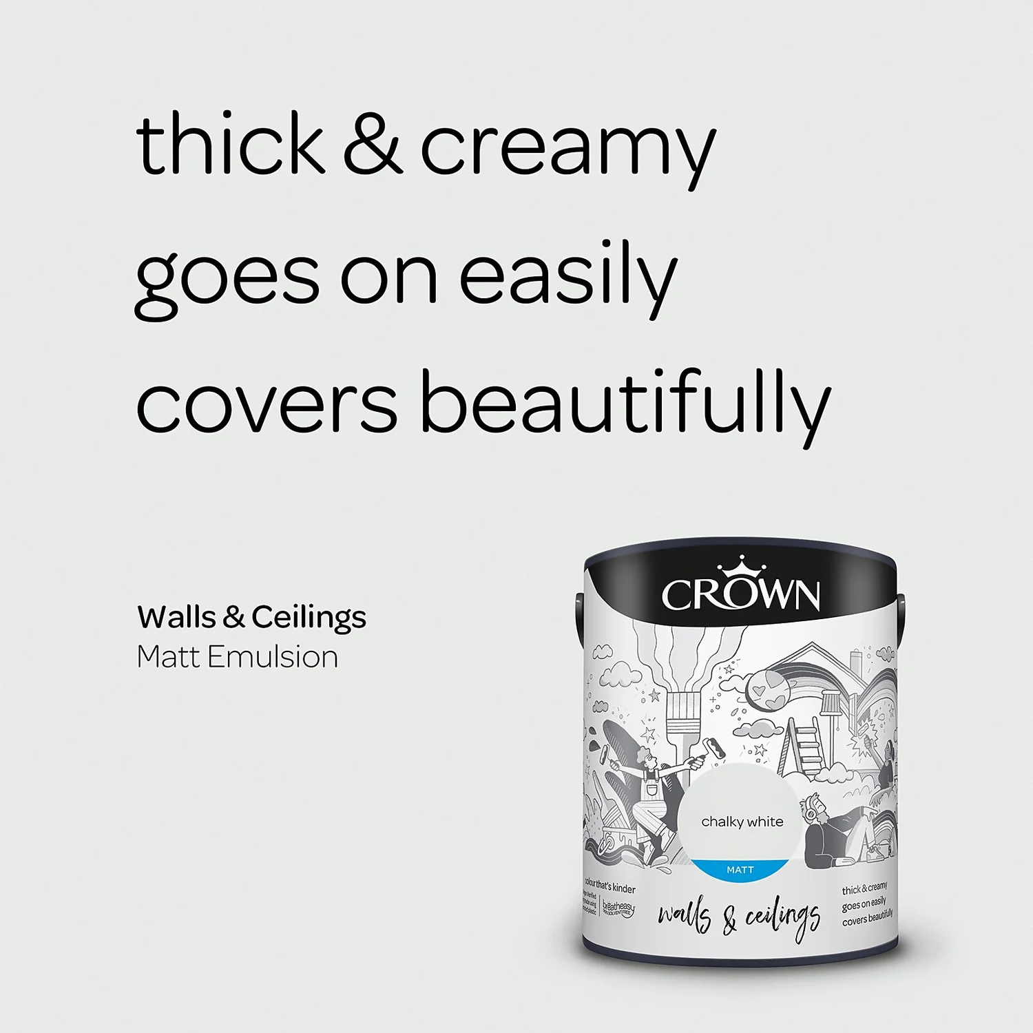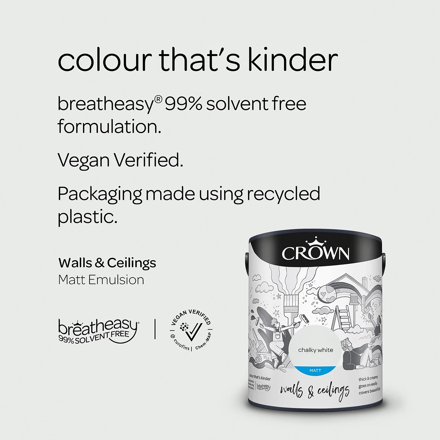 Introducing breatheasy® – Crown’s Leading Formulation. Using carefully selected vegan verified ingredients, Crown’s unique breatheasy® 99% solvent free formulation offers you the confidence to decorate your home safely. Limiting exposure to airborne triggers of asthma and allergy, it helps create a healthier space for your whole family. And we are pushing what’s possible even further with packaging made using recycled plastic.