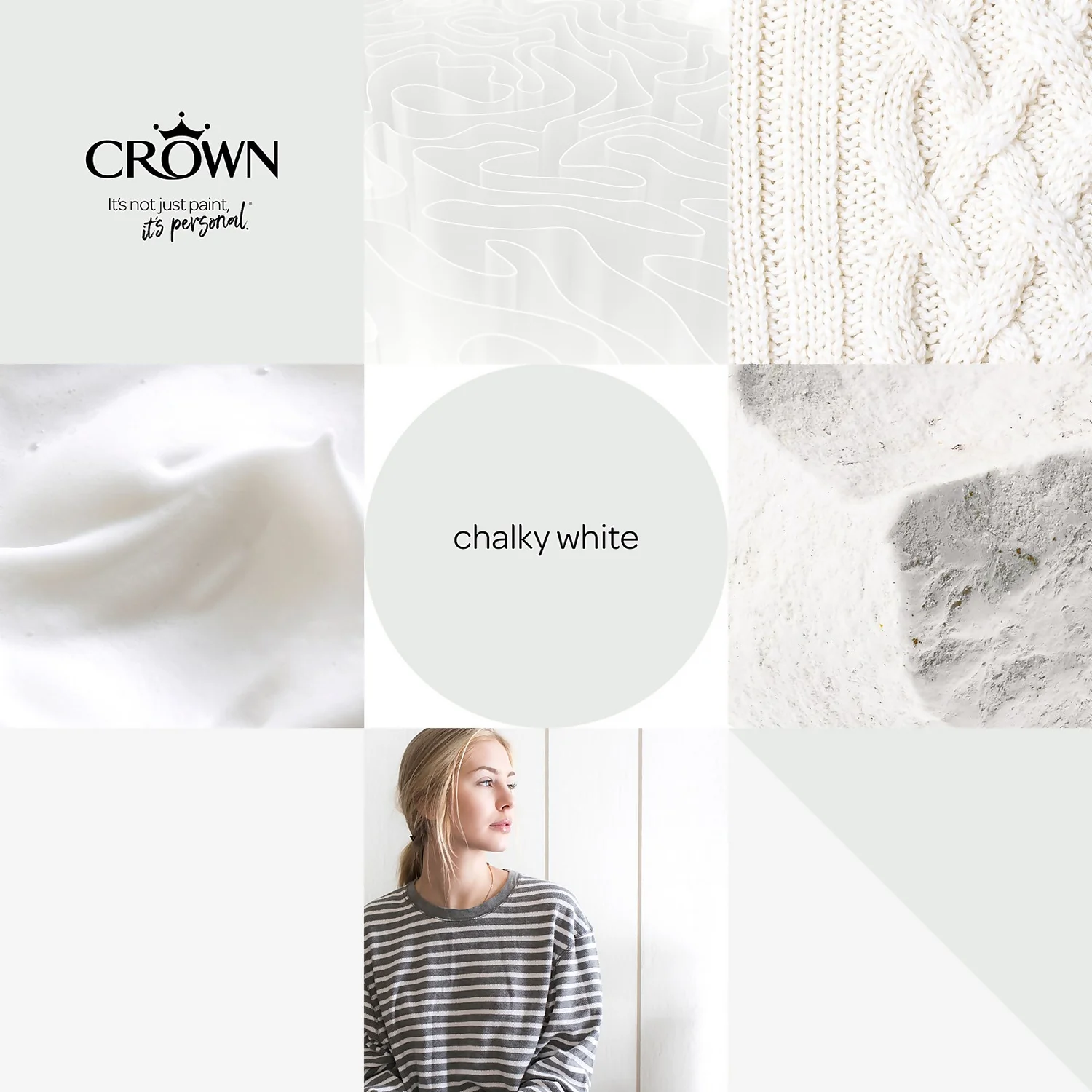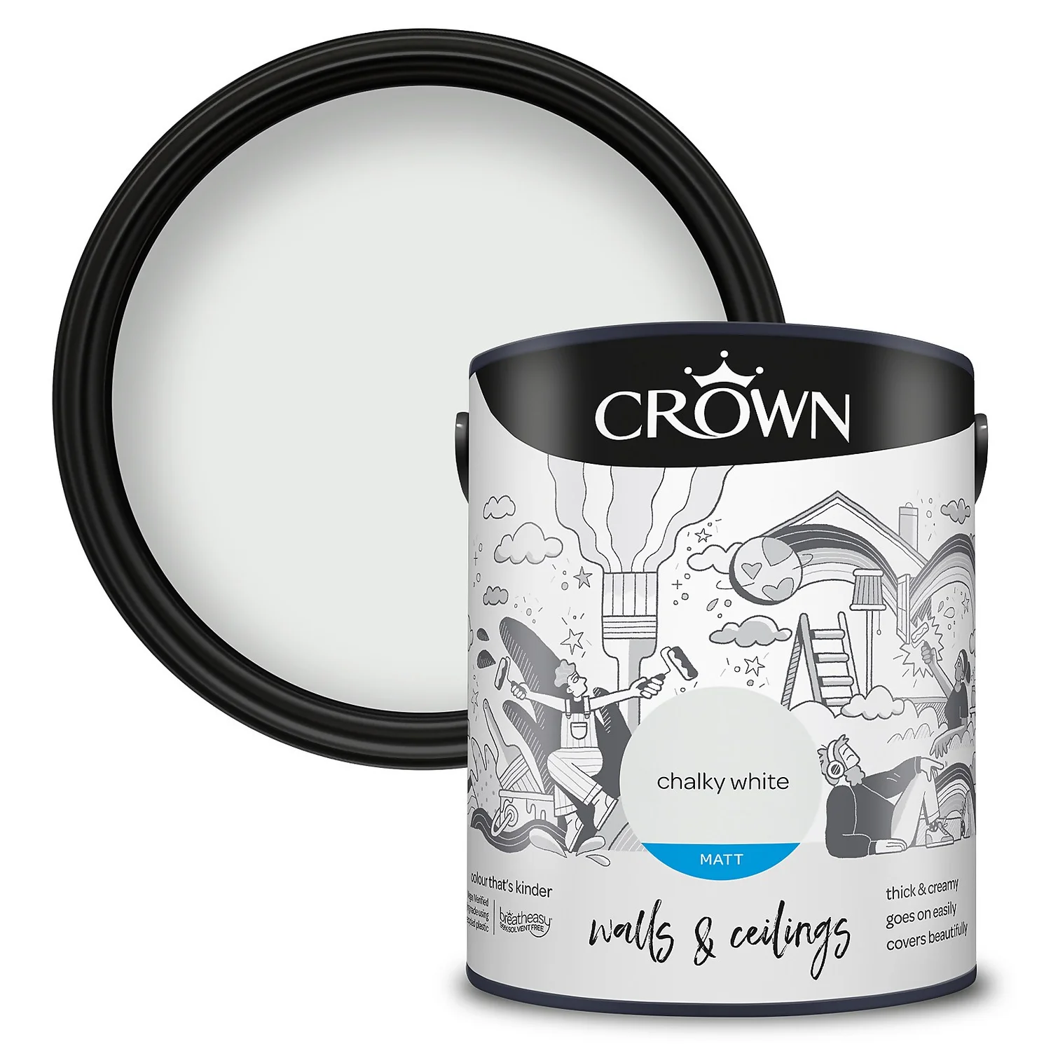 Chalky White – An Off-White Paint for a Cool Finish. One of 40 colours available in this size, Chalky White is a unique shade of off-white paint that provides a cool finish to any room setting. Create a clean, modern feel to any space, and to any room, with this beautiful off-white paint. “A great substitute to white. This off-white colour has hints of a very pale cool Greys, with subtle hues of Greens / blue undertones”- Crown Colour Specialist.