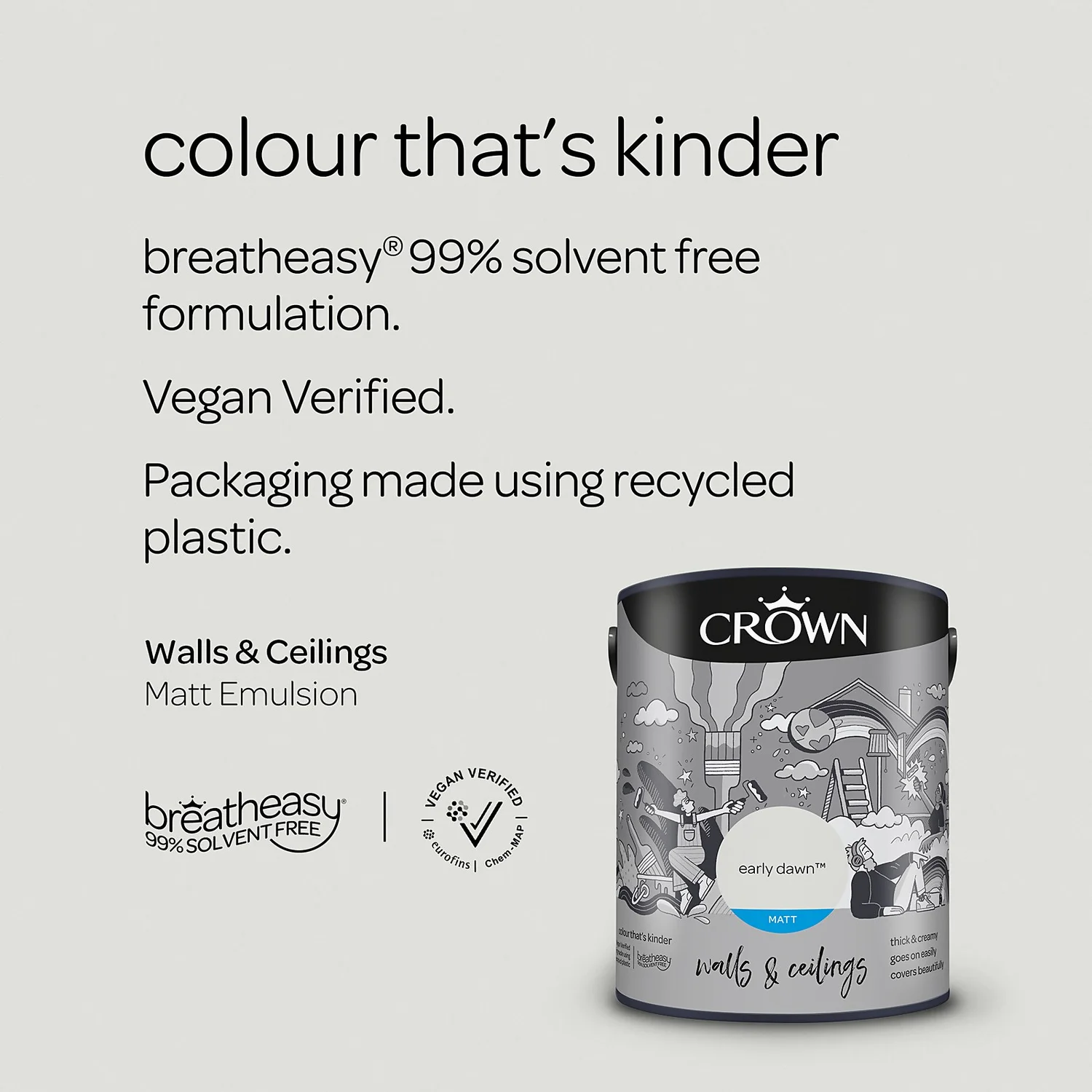 Introducing breatheasy® – Crown’s Leading Formulation. Using carefully selected vegan verified ingredients, Crown’s unique breatheasy® 99% solvent free formulation offers you the confidence to decorate your home safely. Limiting exposure to airborne triggers of asthma and allergy, it helps create a healthier space for your whole family. And we are pushing what’s possible even further with packaging made using recycled plastic.