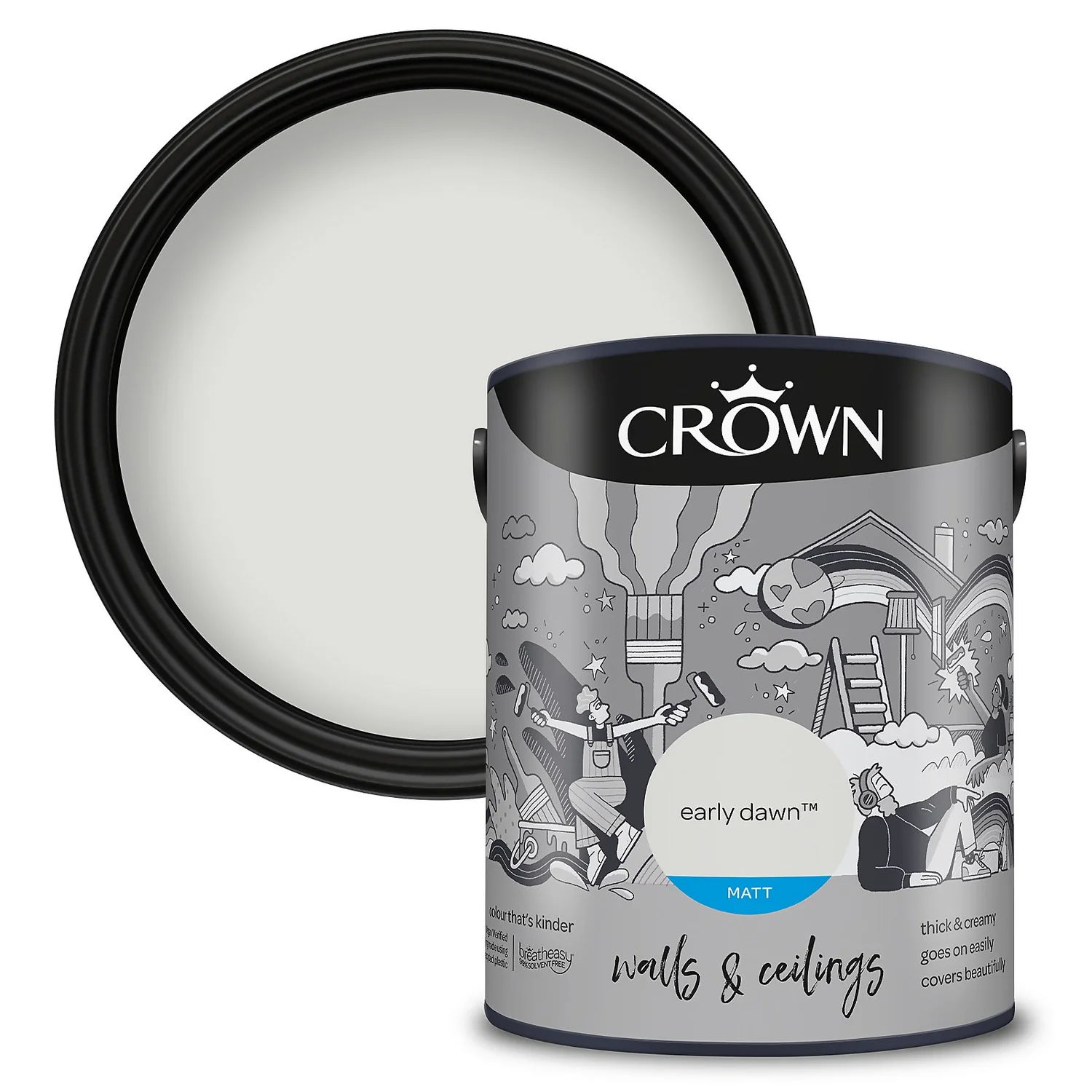 Early Dawn – A Lovely, Warming Greys Paint. One of 40 colours available in this size, Early Dawn is a unique shade of Greys paint that provides a comforting feel to any room setting. Add a touch of warmth to any space, and to any room, with this beautiful Greys paint. ‘Our favourite Greys. A timeless, light, true Greys. Neither cold nor warm, it complements all spaces’- Crown Colour Specialist.