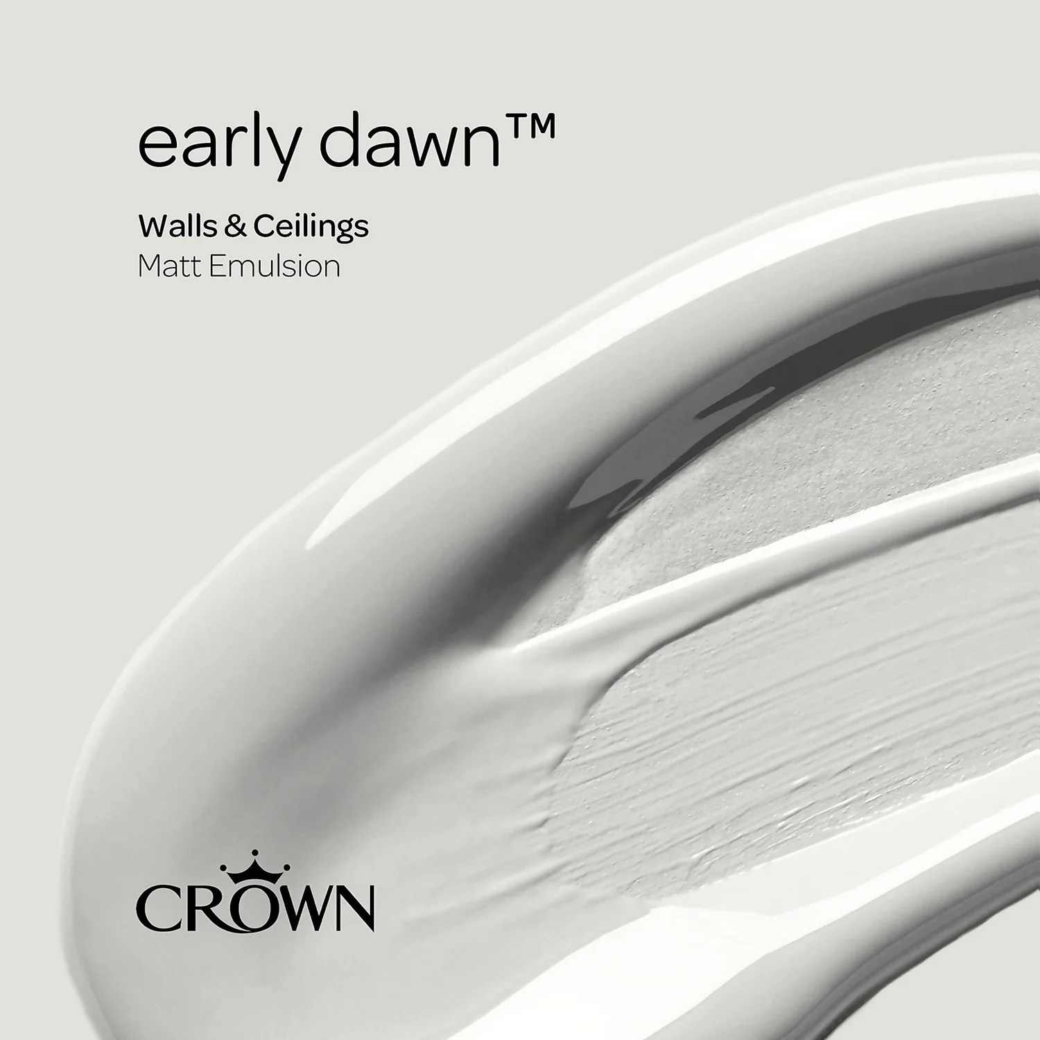 Early Dawn – A Lovely, Warming Greys Paint. One of 80 colours available in this size, Early Dawn is a unique shade of Greys paint that provides a comforting feel to any room setting. Add a touch of warmth to any space, and to any room, with this beautiful Greys paint. ‘Our favourite Greys. A timeless, light, true Greys. Neither cold nor warm, it complements all spaces’- Crown Colour Specialist.