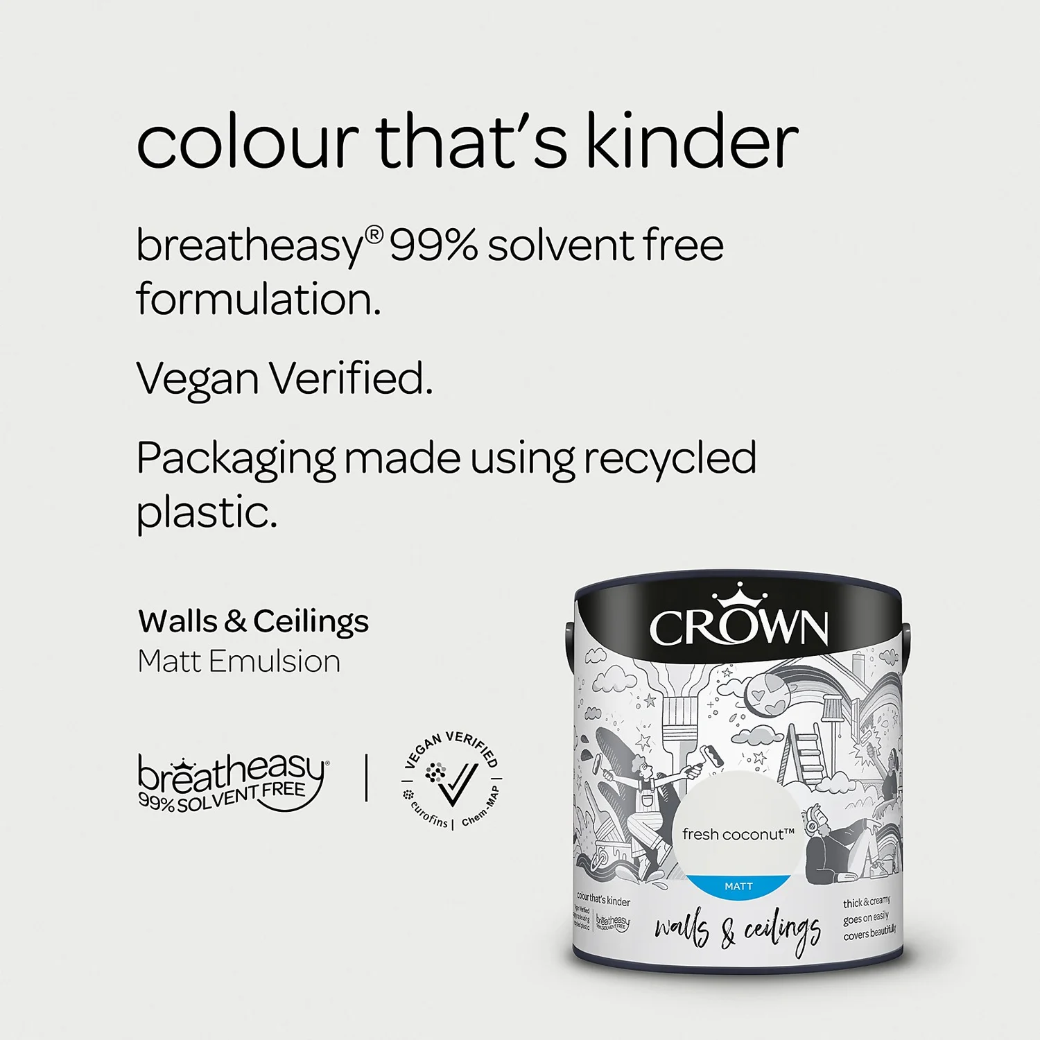 Introducing breatheasy® – Crown’s Leading Formulation. Using carefully selected vegan verified ingredients, Crown’s unique breatheasy® 99% solvent free formulation offers you the confidence to decorate your home safely. Limiting exposure to airborne triggers of asthma and allergy, it helps create a healthier space for your whole family. And we are pushing what’s possible even further with packaging made using recycled plastic.