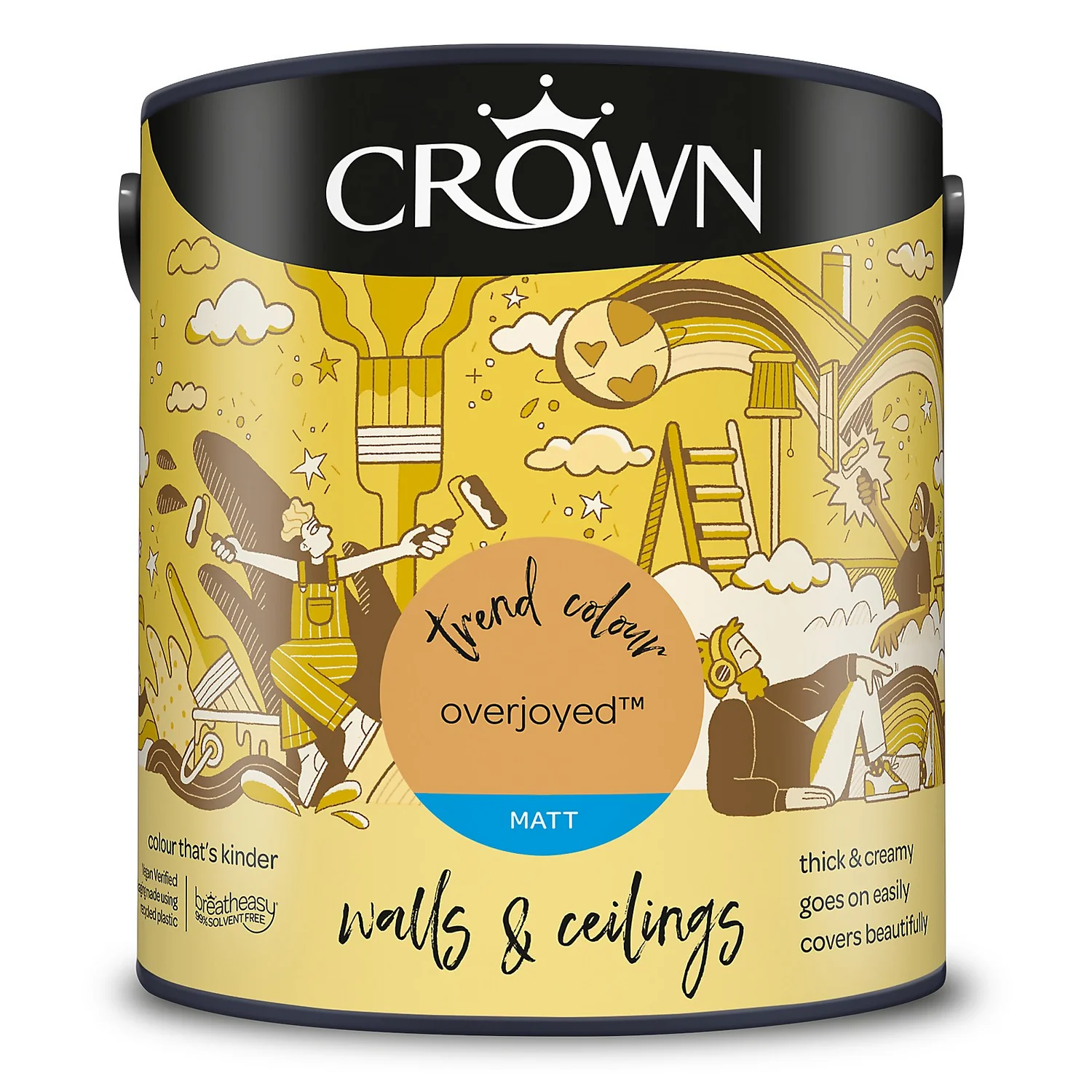 Overjoyed – A Lovely, Warming yellow Paint. One of 80 colours available in this size, Overjoyed is a unique shade of yellow paint that provides a comforting feel to any room setting. Add a touch of warmth to any space, and to any room, with this beautiful yellow paint. ‘Slightly darker and more muted than a bright mustard yellow, Overjoyed lives up to its namesake with it’s upbeat and positive nature’- Crown Colour Specialist.
