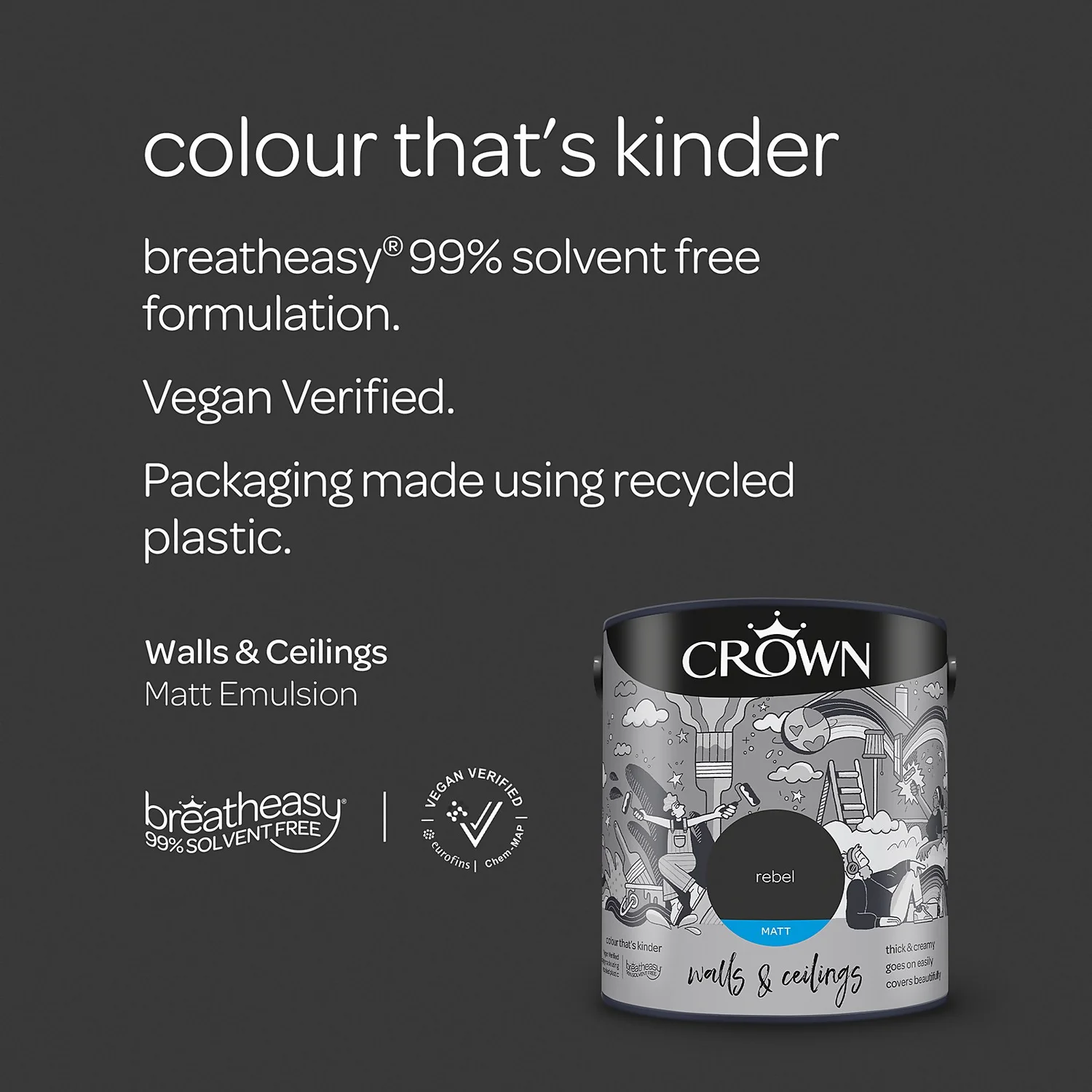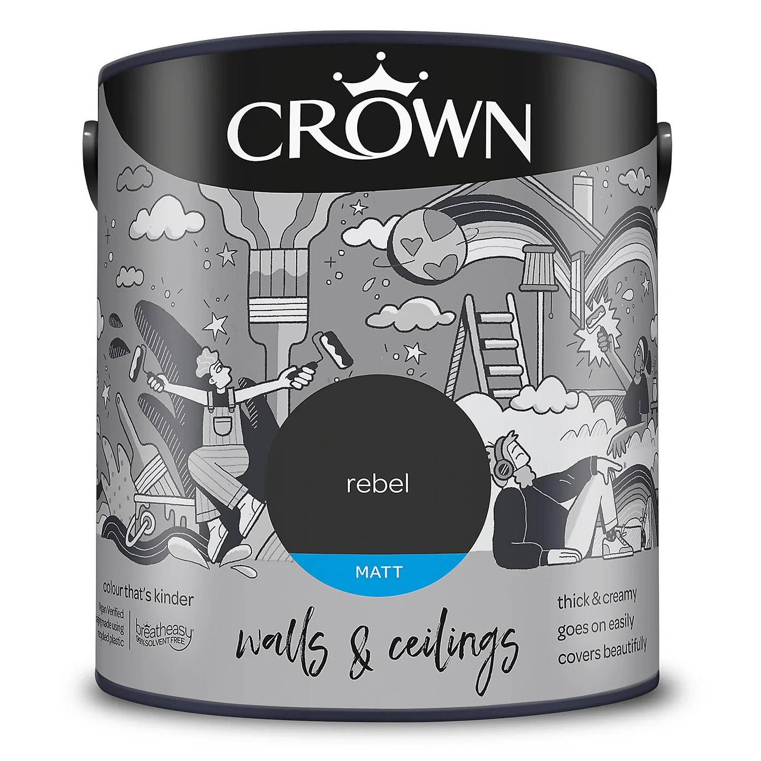 Rebel – A Black Paint that Creates a Statement. One of 80 colours available in this size, Rebel is a unique shade of Greys paint that provides a comforting feel to any room setting. Add a touch of warmth to any space, and to any room, with this beautiful Greys paint. “A nearly black which can act as a canvas by drawing attention to other elements within a space. Great on all four walls to create a sense of depth”- Crown Colour Specialist.