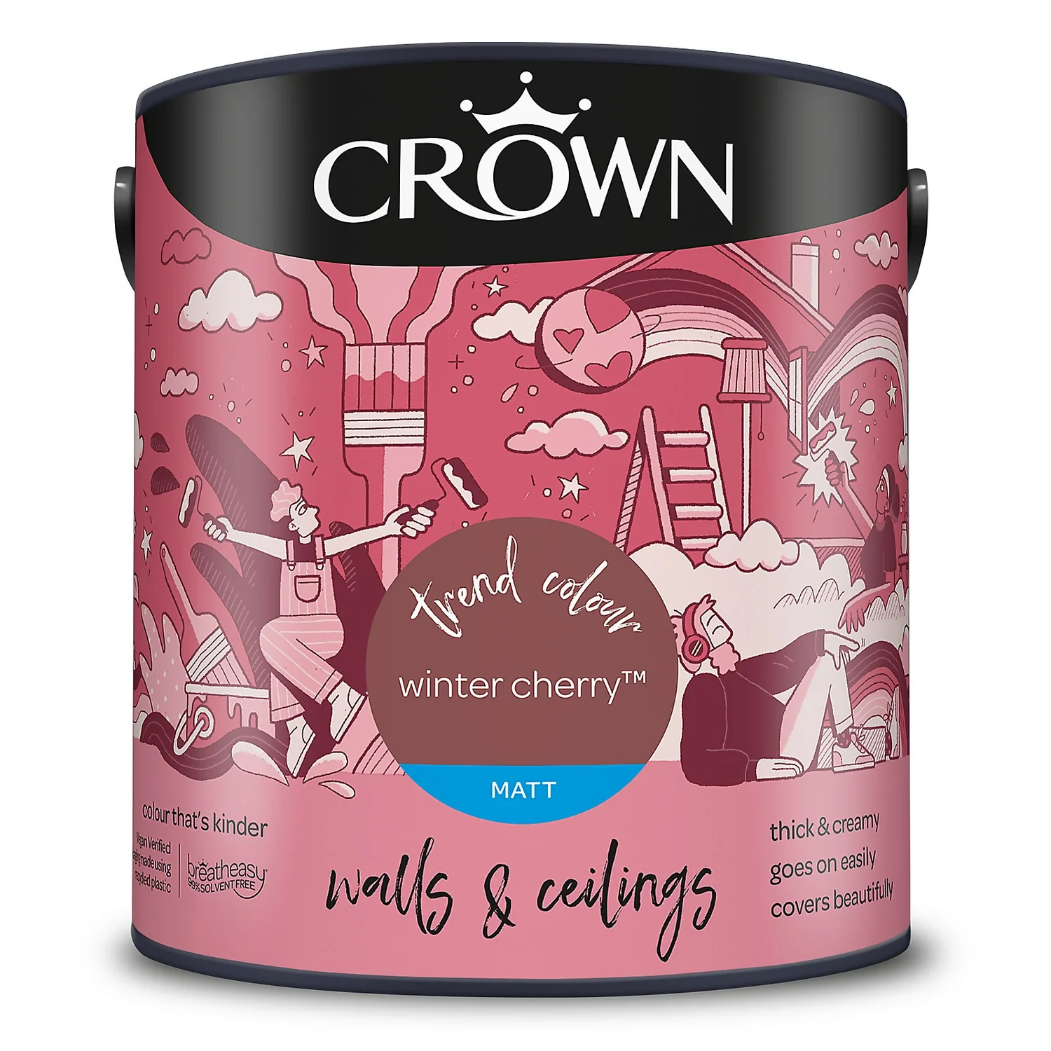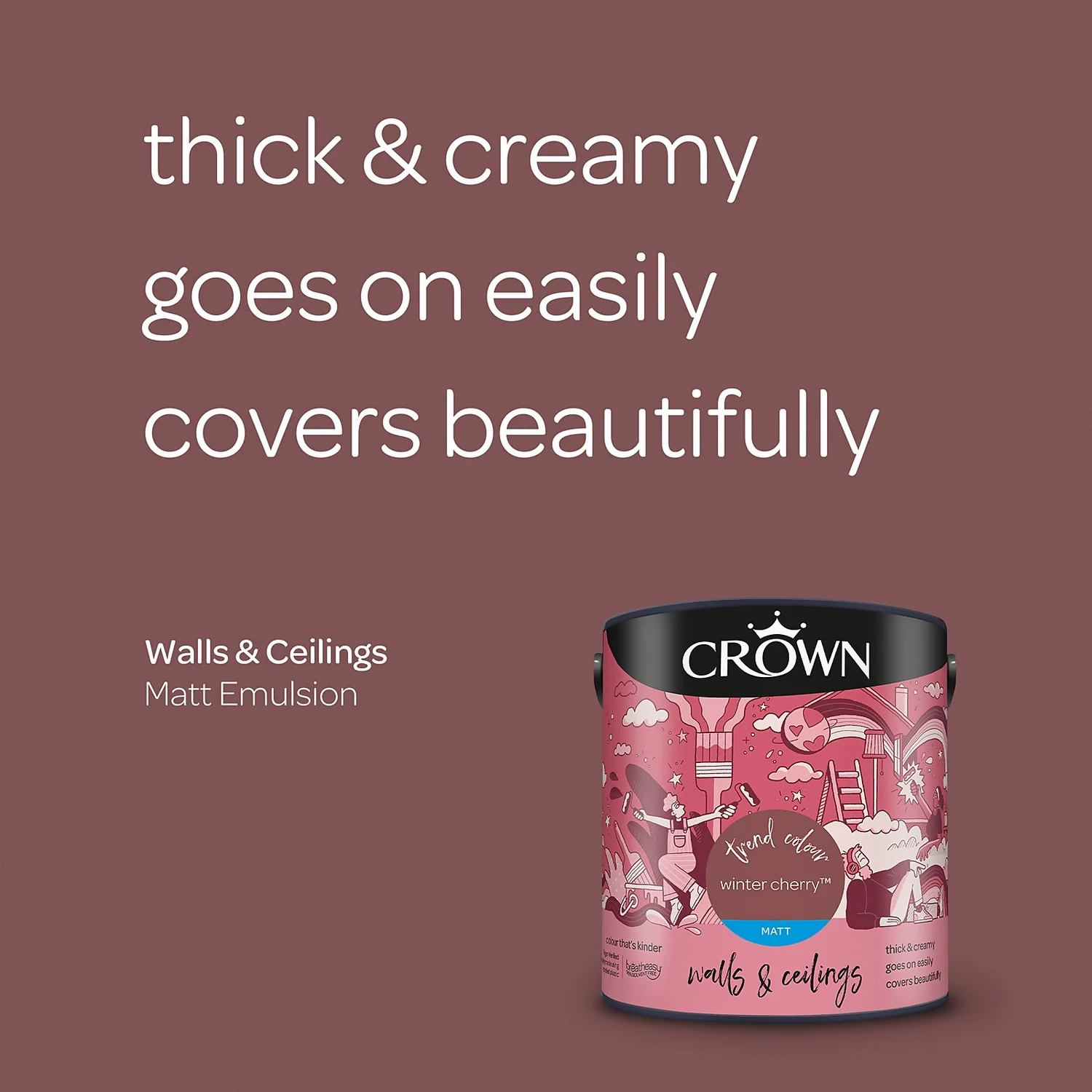 Winter Cherry – A Lovely, Warming pink Paint. One of 80 colours available in this size, Winter Cherry is a unique shade of pink paint that provides a comforting feel to any room setting. Add a touch of warmth to any space, and to any room, with this beautiful pink paint. ‘A timeless shade, this soft brownish red is a low intensity hue which means it will sit quietly amongst furniture and accessories and won’t dominate a space’- Crown Colour Specialist.