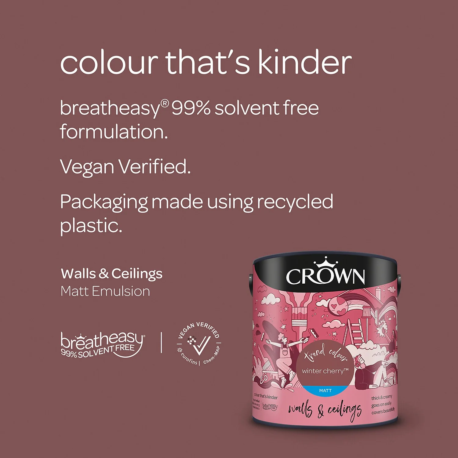 Introducing breatheasy® – Crown’s Leading Formulation. Using carefully selected vegan verified ingredients, Crown’s unique breatheasy® 99% solvent free formulation offers you the confidence to decorate your home safely. Limiting exposure to airborne triggers of asthma and allergy, it helps create a healthier space for your whole family. And we are pushing what’s possible even further with packaging made using recycled plastic.