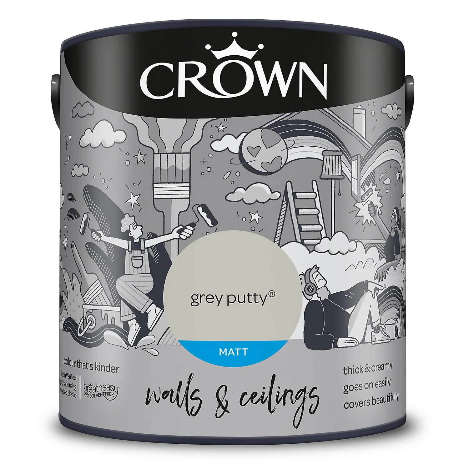 Grey Putty – The Epitome of a True Light Grey Paint. One of 80 colours available in this size, Grey Putty is a unique shade of light grey paint that provides a touch of elegance to any room setting. Combine traditional and contemporary to any space, and to any room, with this beautiful light grey paint. A true light grey that provides a sense of elegance, but which works better in a south facing room, or in a room with lots of natural light. – Crown Colour Specialist.
