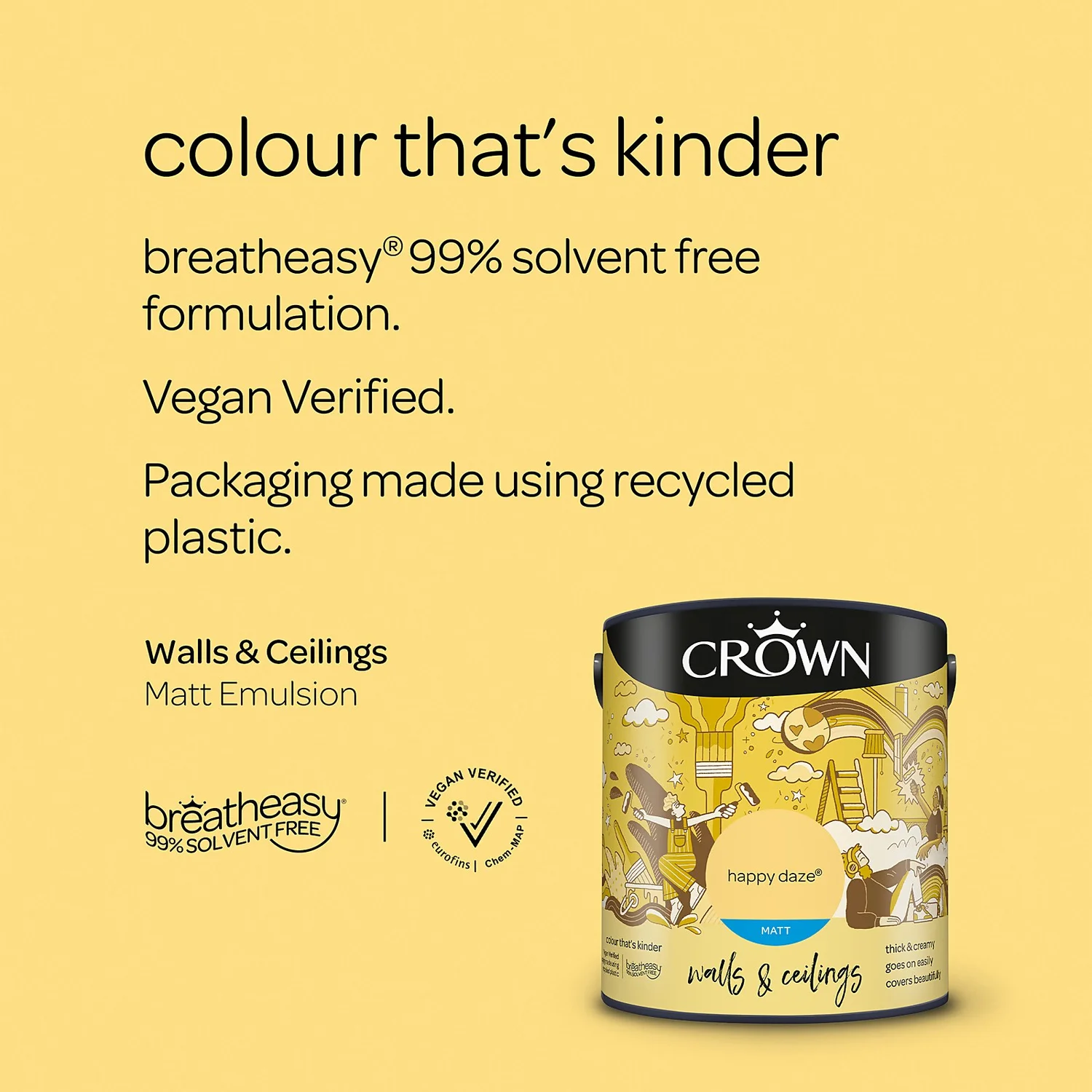 Happy Daze – A Bright and Optimistic Yellows Paint. One of 80 colours available in this size, Happy Daze is a unique shade of bright Yellows paint that provides optimism and energy to any room setting. Instantly add a pop of colour to any space, and to any room, with this beautiful bright Yellows paint. This bright and optimistic shade is a great colour to use in north facing rooms. Pair with Crown’s Aftershow or Rebel coloured accessories to create a graphic and striking scheme. Use a shade such as Crown’s Snowfall for a calmer look. – Crown Colour Specialist.