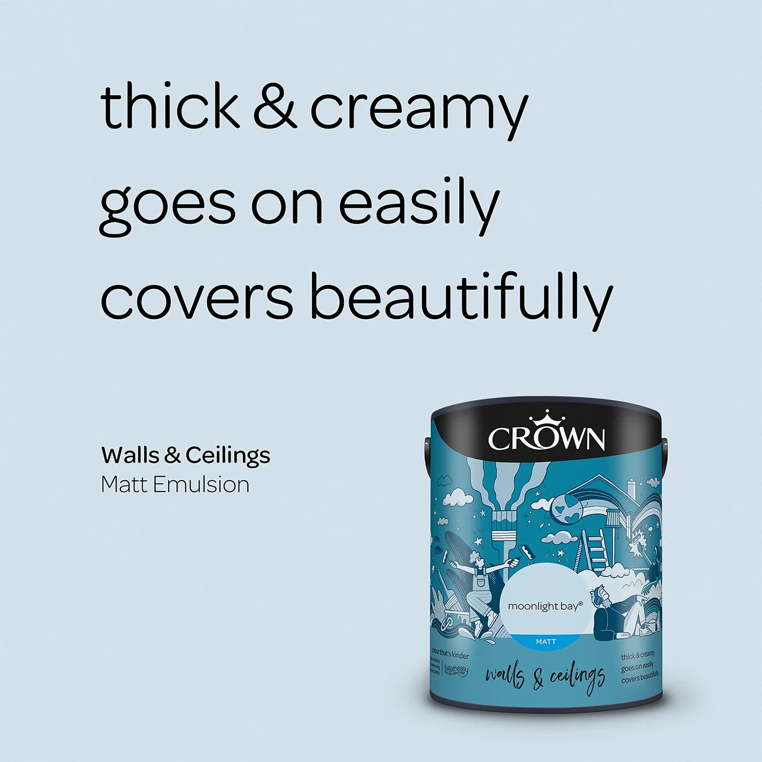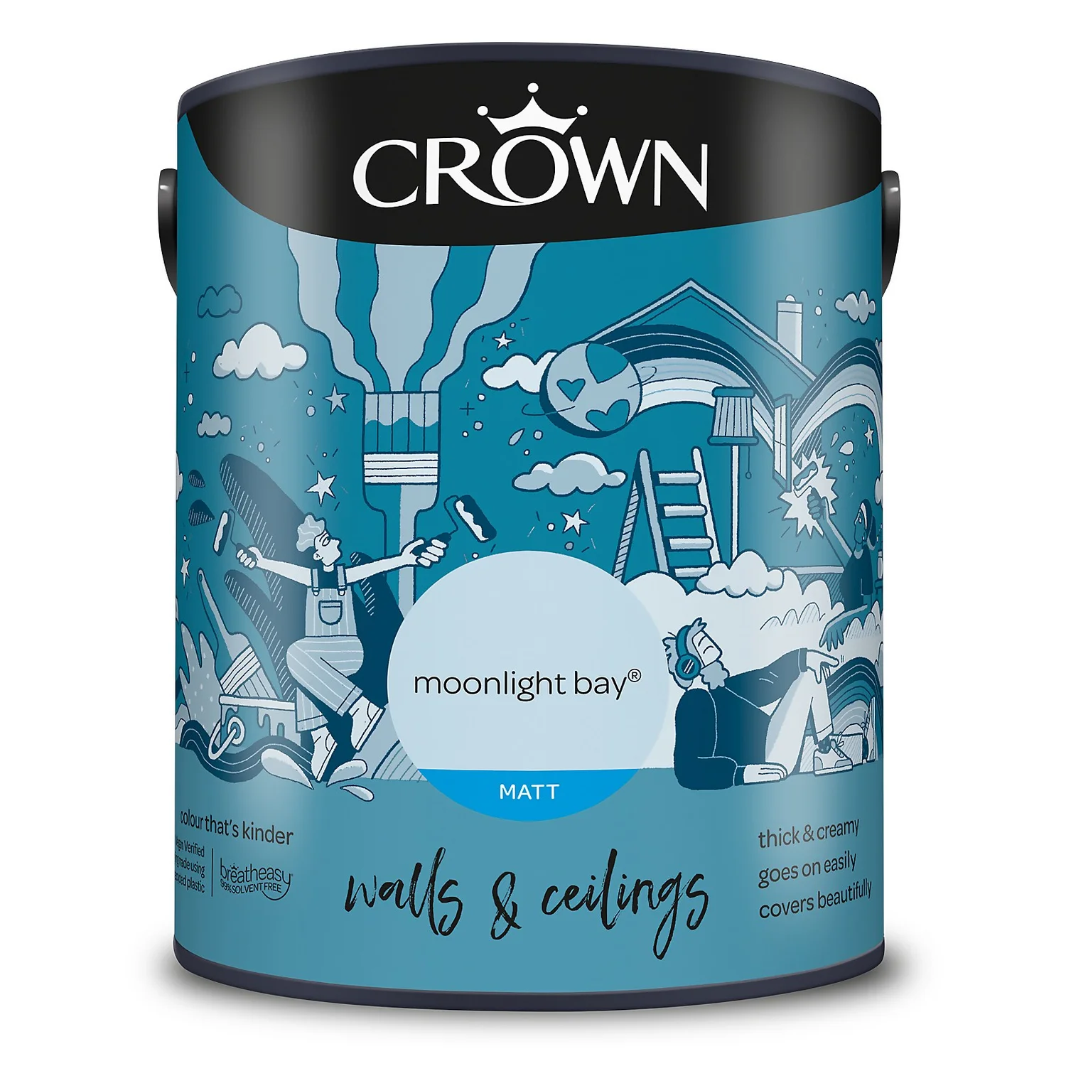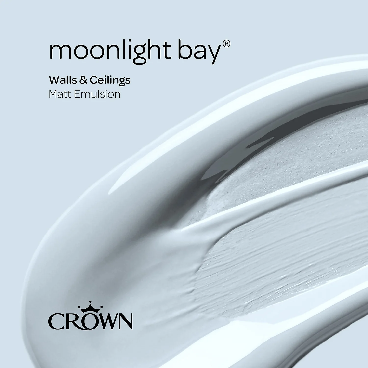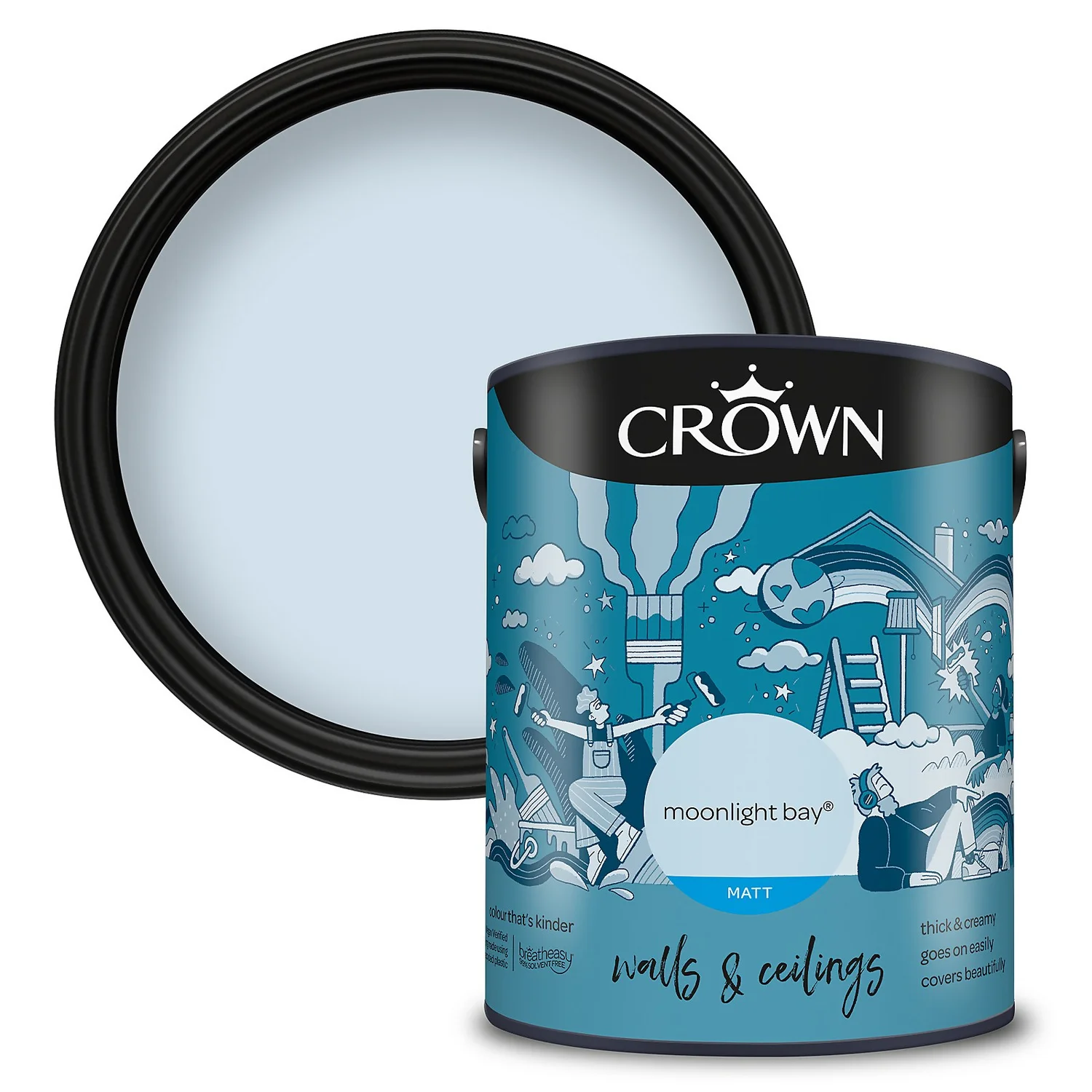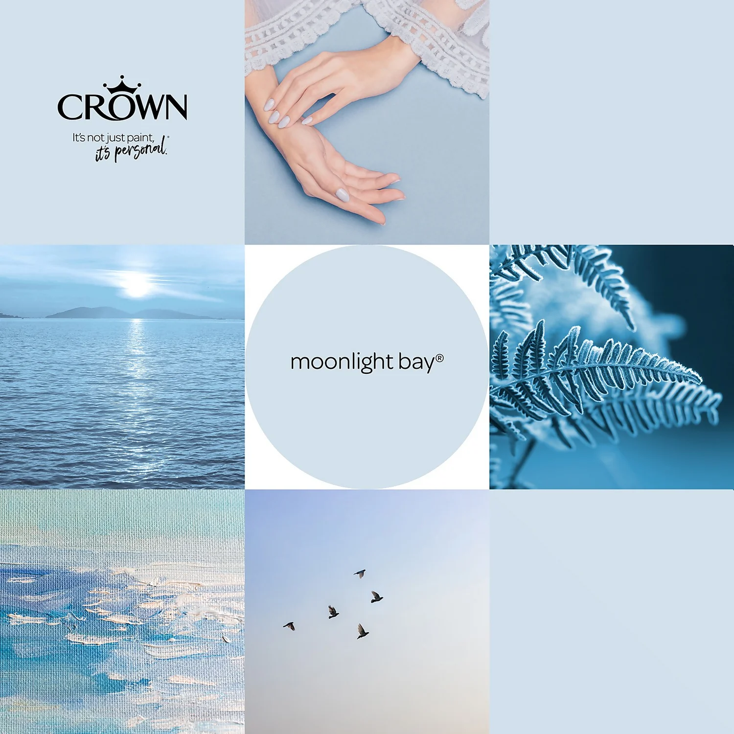 Moonlight Bay – A Lovely, Soft Light Blues Paint. One of 40 colours available in this size, Moonlight Bay is a unique shade of light Blues paint that provides a calming and airy feel to any room setting. Freshen up any space, and any room, with this beautiful pale Blues paint. A lovely soft, light, pale Blues which works well with a multitude of colours, including Crown’s Mustard Jar, Rebel and Powdered Clay. – Crown Colour Specialist.