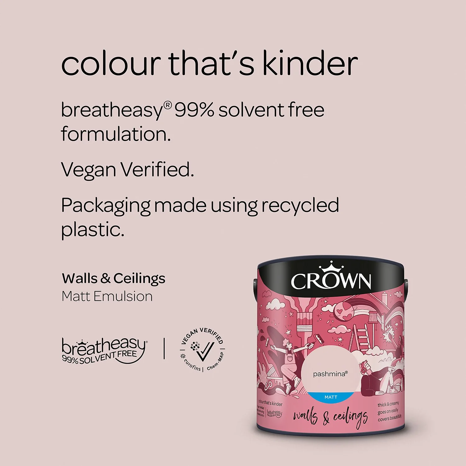 Introducing breatheasy -Crown’s Leading Formulation. Using carefully selected vegan verified ingredients, Crown’s unique breatheasy 99% solvent free formulation offers you the confidence to decorate your home safely. Limiting exposure to airborne triggers of asthma and allergy, it helps create a healthier space for your whole family. And we are pushing what’s possible even further with packaging made using recycled plastic.