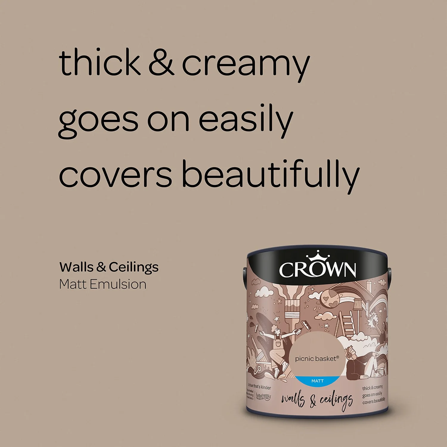 Picnic Basket – A Warm Light Brown Paint. One of 80 colours available in this size, Picnic Basket is a unique shade of light brown paint that provides a touch of elegance to any room setting. Create a soothing, warming space to any room, with this beautiful light brown paint. A warm light brown which looks lovely when paired with Crown’s Midnight Navy or Teal, for an added touch of luxury. – Crown Colour Specialist.
