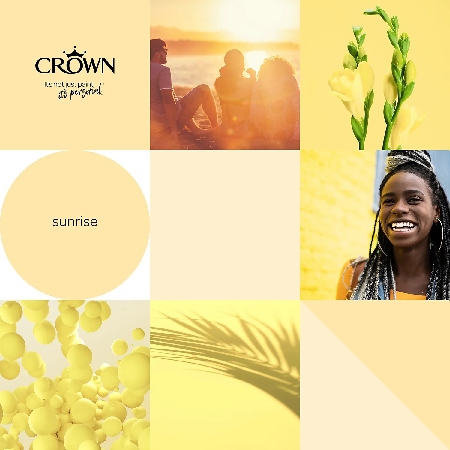 Sunrise – A Bright and Cheerful Light Yellows Paint. One of 80 colours available in this size, Sunrise is a unique shade of light Yellows paint that adds a pop of colour to any room setting. Create a cheerful and inviting environment to any space, and to any room, with this beautiful bright Yellows paint. Like its namesake, Sunrise is a light, bright and cheerful Yellows which brightens up any space. Perfect for north facing rooms. Works surprisingly well with Crown’s Botanical Extract. For a very subtle tonal scheme, pair with Crown’s Delicate Cream. – Crown Colour Specialist.