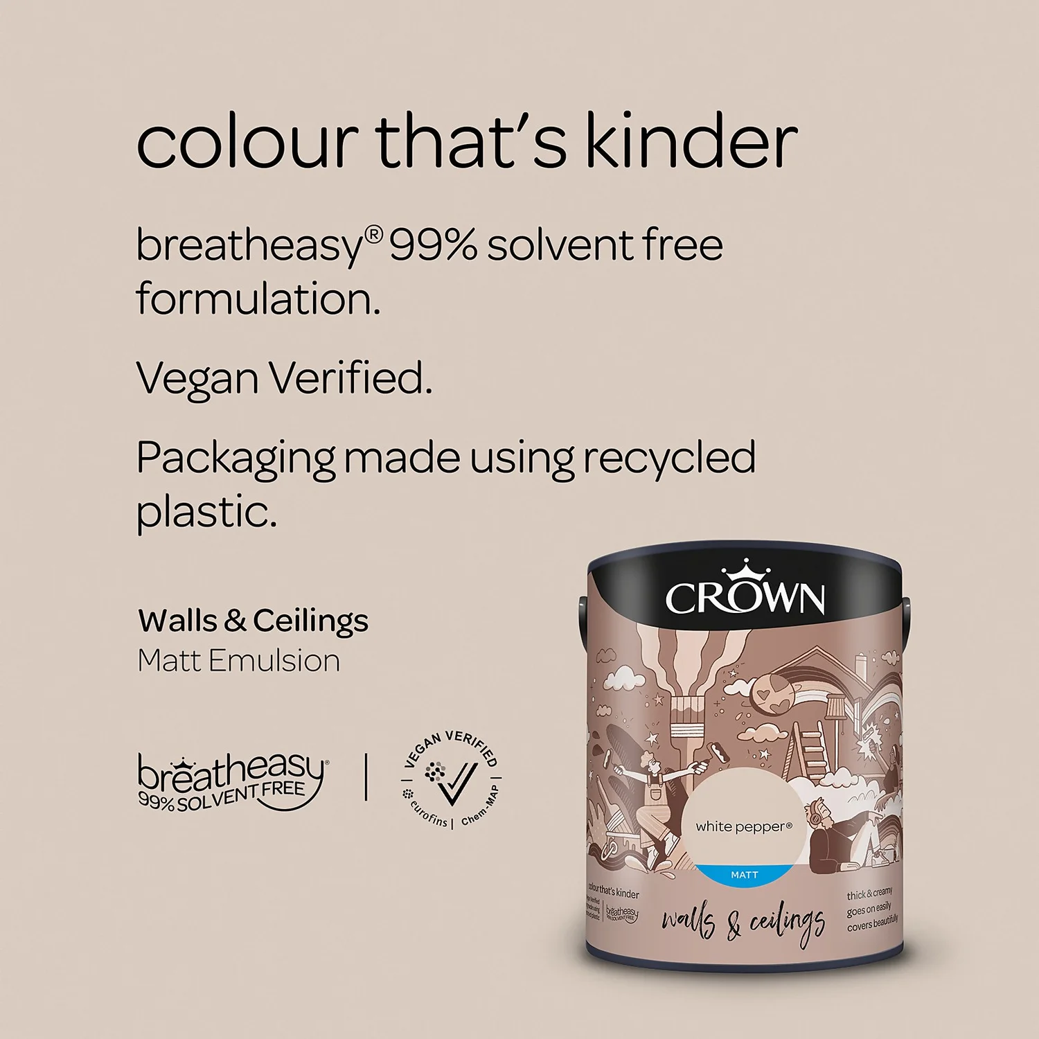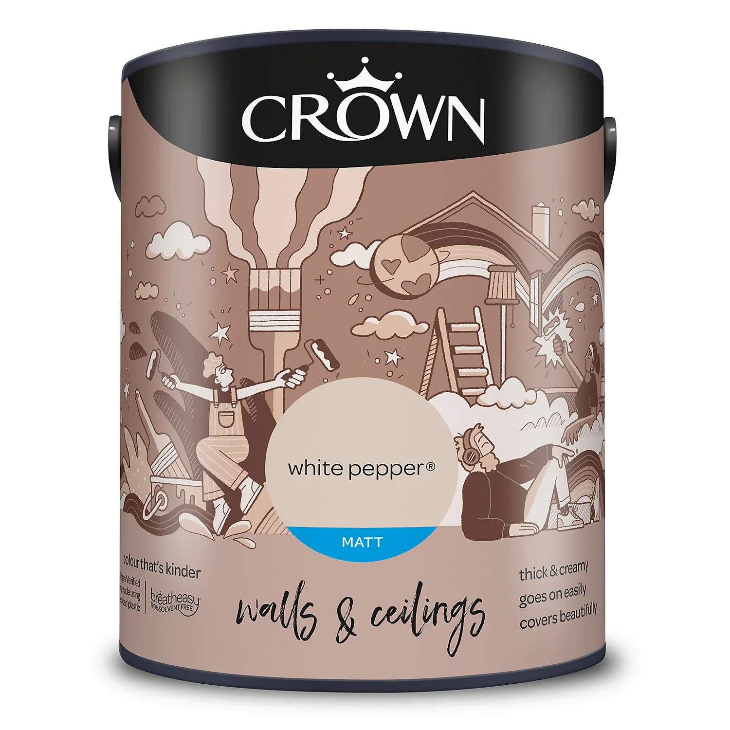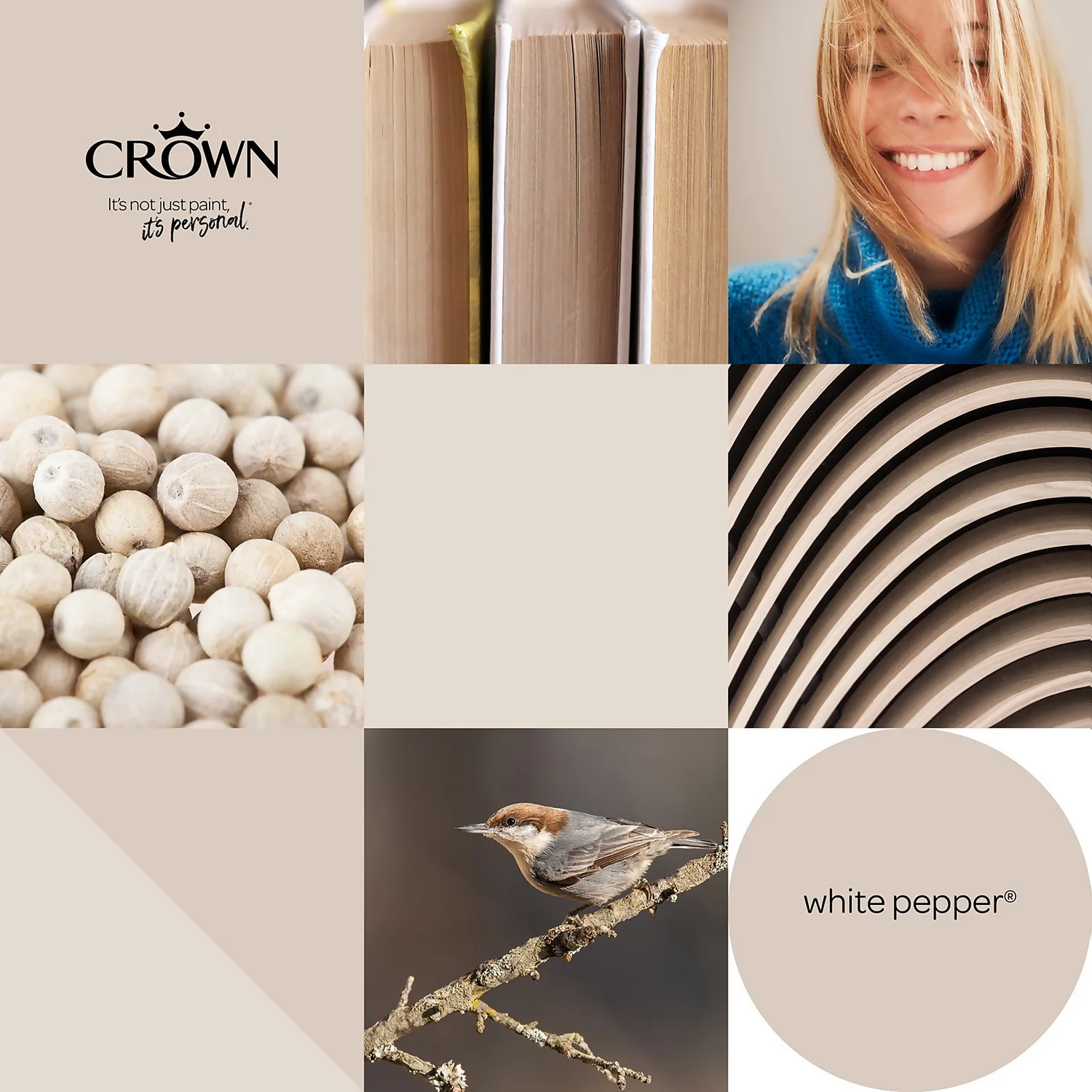 White Pepper – A Lovely, Warming Neutrals Paint. One of 40 colours available in this size, White Pepper is a unique shade of Neutrals paint that provides a comforting feel to any room setting. Add a touch of warmth to any space, and to any room, with this beautiful Neutrals paint. This lovely Neutrals shade helps to create a comforting space. The warm Neutrals tone works well with all shades. Accessorize with soft, sumptuous textures. – Crown Colour Specialist.