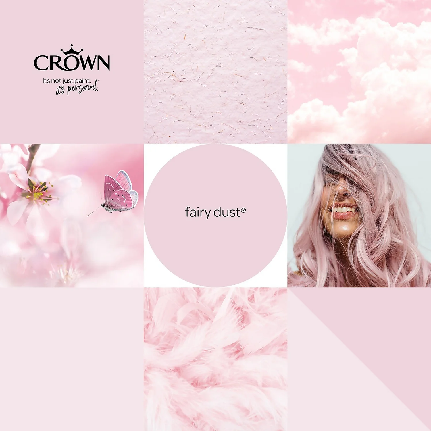 Fairy Dust – Add a Sprinkle of Magic with this Mid Pink Paint. One of 32 colours available in this size, Fairy Dust is a unique shade of mid pink paint that provides a sprinkle of magic to any room setting. Soften and lighten up any space, and any room, with this beautiful mid pink paint. A dainty pink which can be paired with Crown’s Grey Putty or Smoked Glass for a light and charming look. Alternatively, pair with shades like Crown’s Teal for a more upbeat and energetic space.” – Crown Colour Specialist.