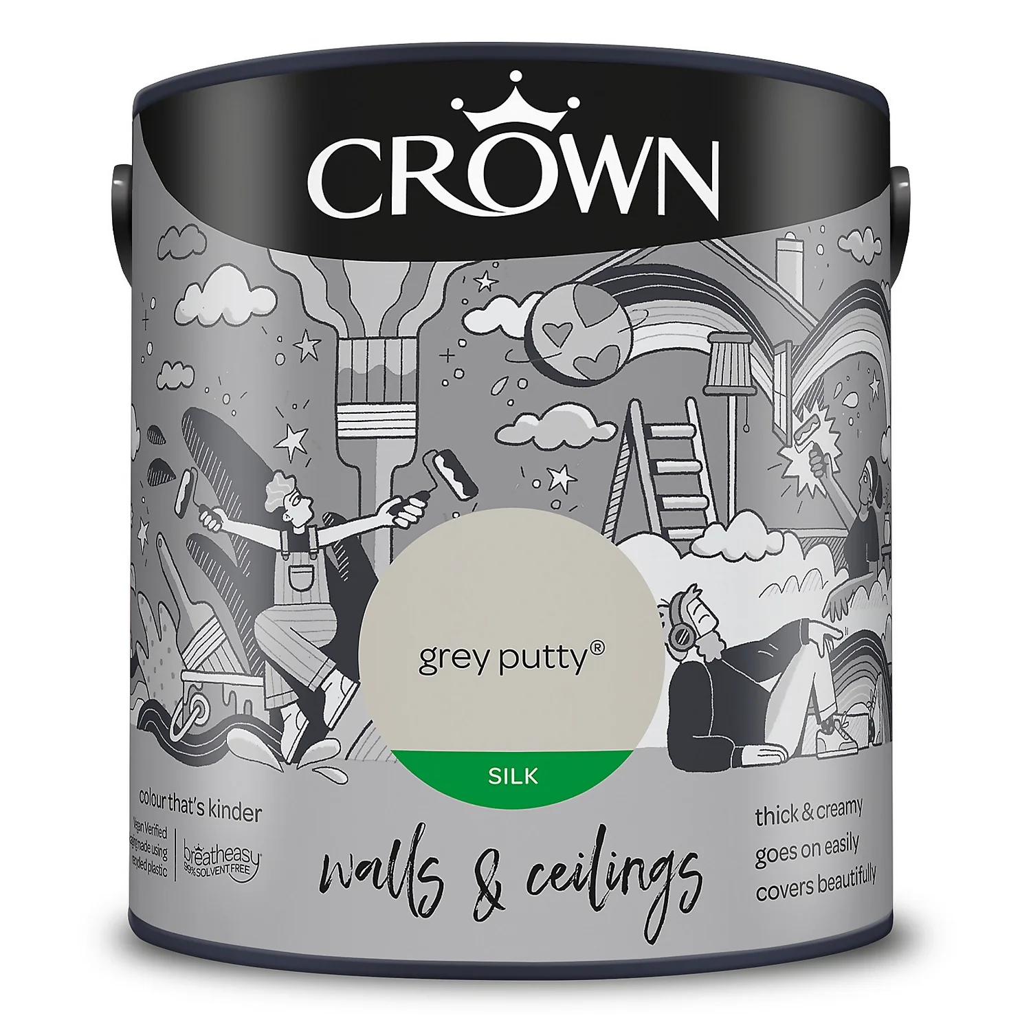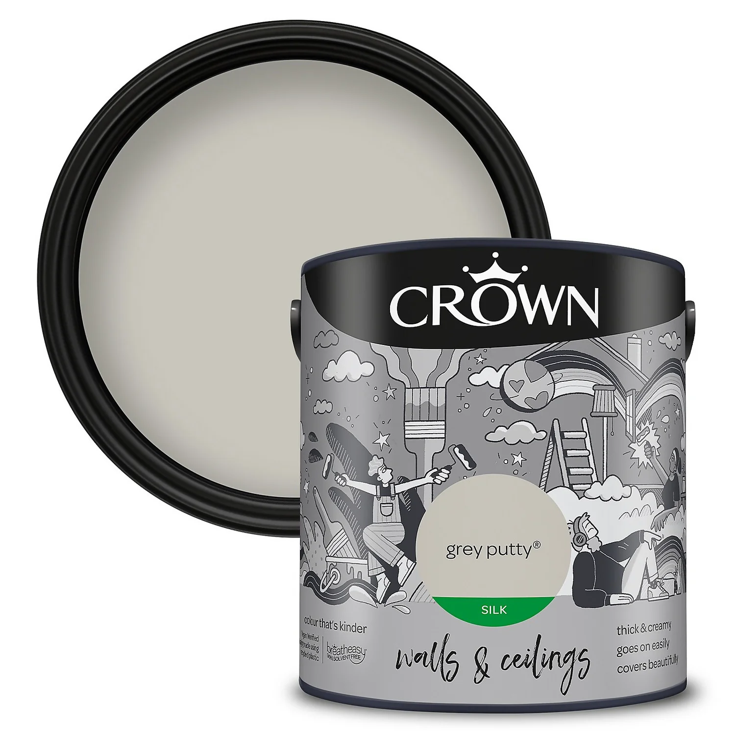 Grey Putty – The Epitome of a True Light Grey Paint. One of 32 colours available in this size, Grey Putty is a unique shade of light grey paint that provides a touch of elegance to any room setting. Combine traditional and contemporary to any space, and to any room, with this beautiful light grey paint. A true light grey that provides a sense of elegance, but which works better in a south facing room, or in a room with lots of natural light. – Crown Colour Specialist.
