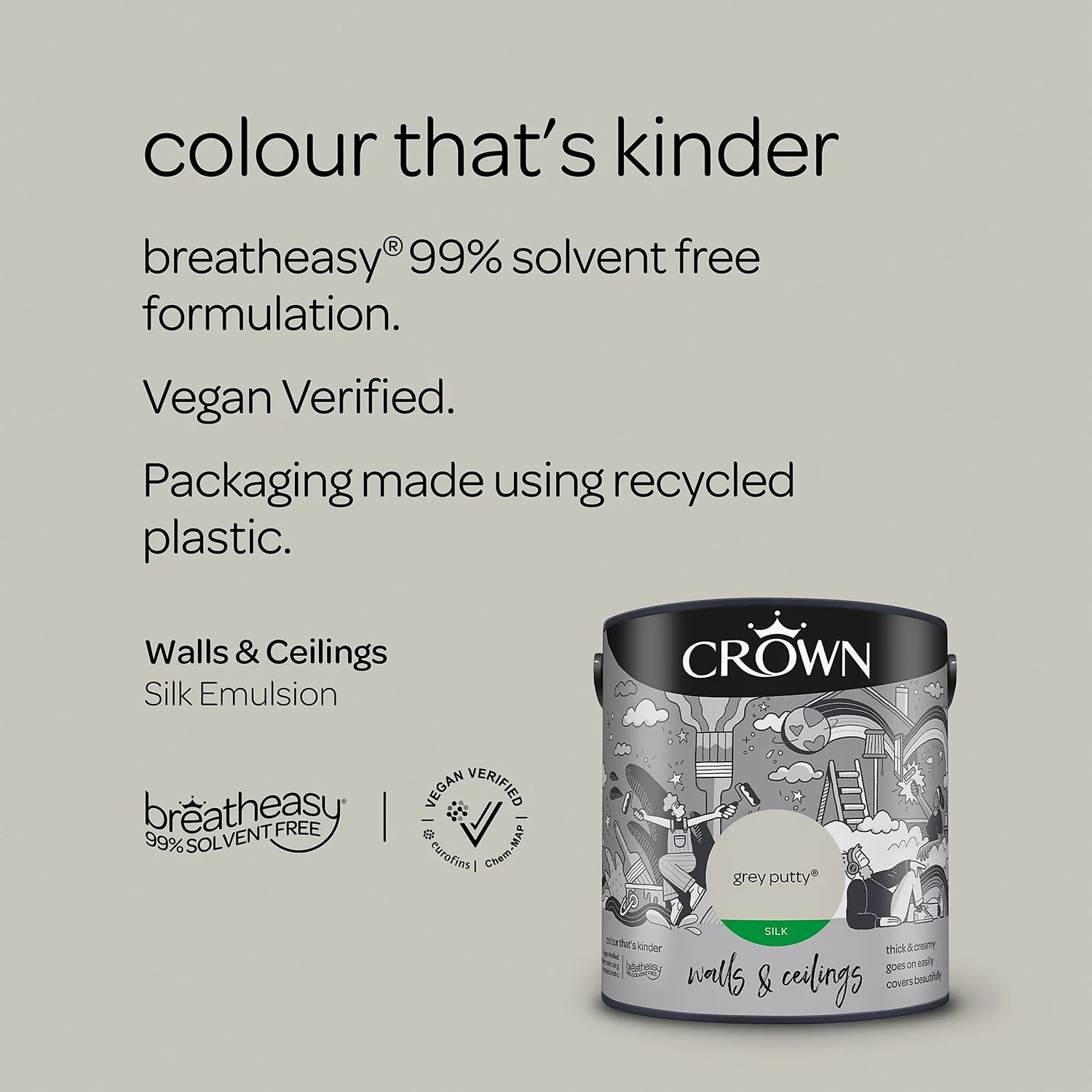 Introducing breatheasy -Crown’s Leading Formulation. Using carefully selected vegan verified ingredients, Crown’s unique breatheasy 99% solvent free formulation offers you the confidence to decorate your home safely. Limiting exposure to airborne triggers of asthma and allergy, it helps create a healthier space for your whole family. And we are pushing what’s possible even further with packaging made using recycled plastic.